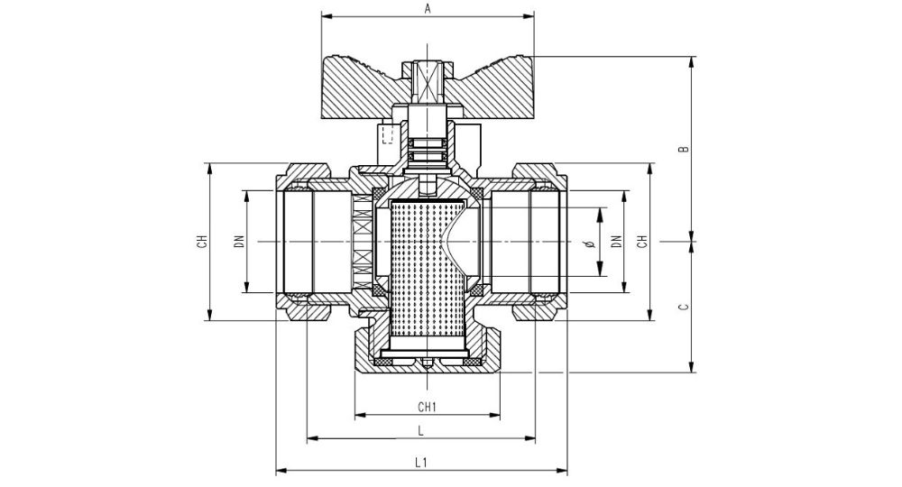 Valvola a sfera con filtro incorporato Connessioni a compressione con maniglia a farfalla rossa Maglia filtro: 500 μ
